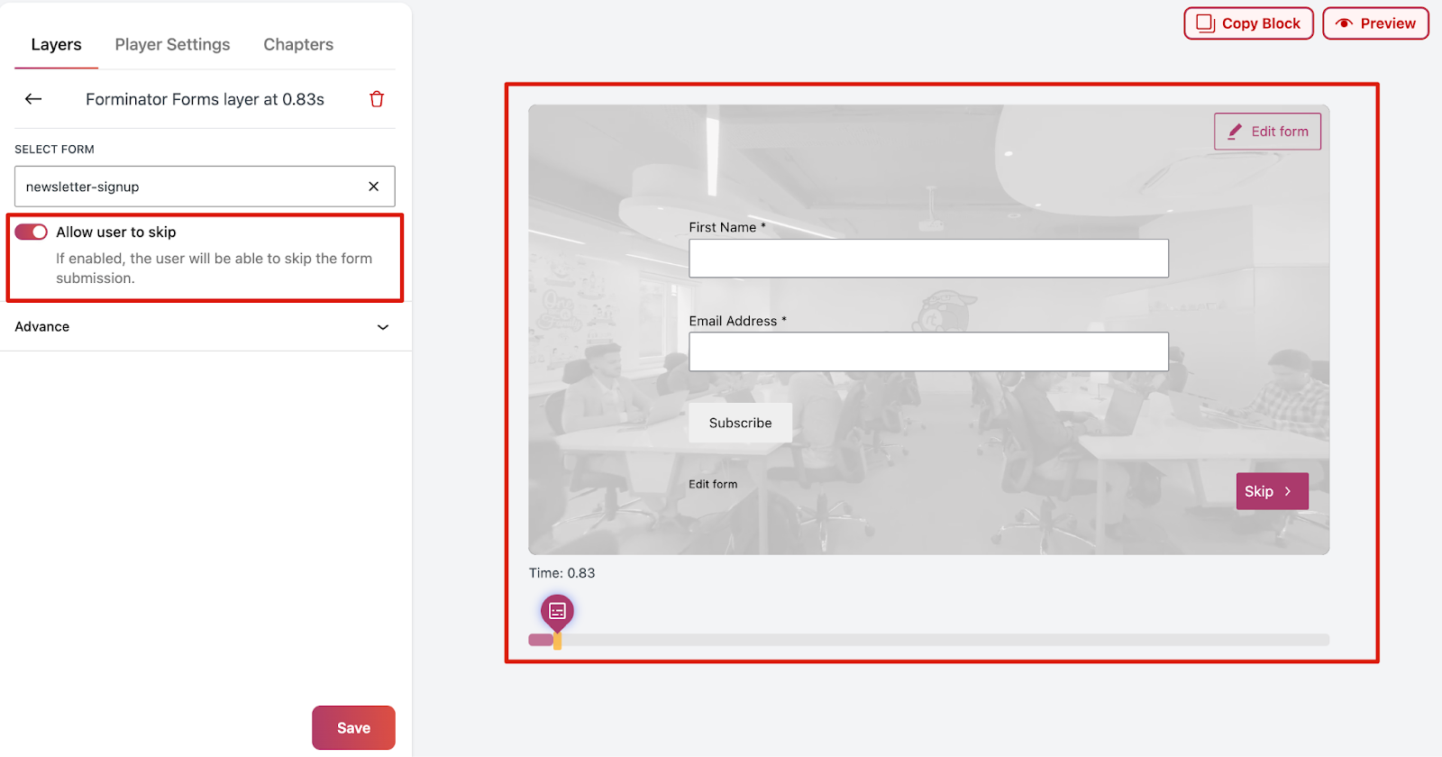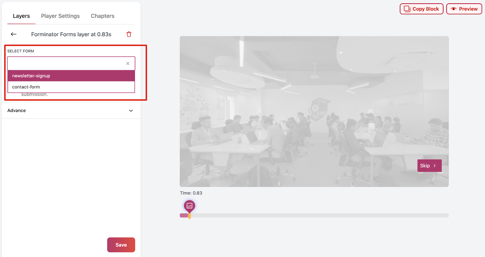 How to integrate the Forminator Forms inside a video at a specific timestamp