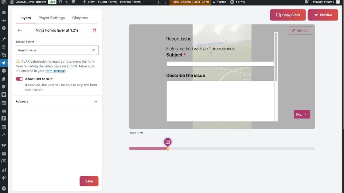 Ninja Forms is a beginner-friendly WordPress form builder that lets you create professional forms using a simple drag-and-drop interface. GoDAM Ninja Forms integration enables you to capture leads directly from videos when embedded as an interactive video layer. The integration’s form recorder feature allows users to record or upload videos right inside the form, from their webcam, screen, or local files. It’s perfect for use cases like video job applications, customer feedback, identity verification, and auditions. All form entries are conveniently accessible from the Ninja Forms submissions dashboard.