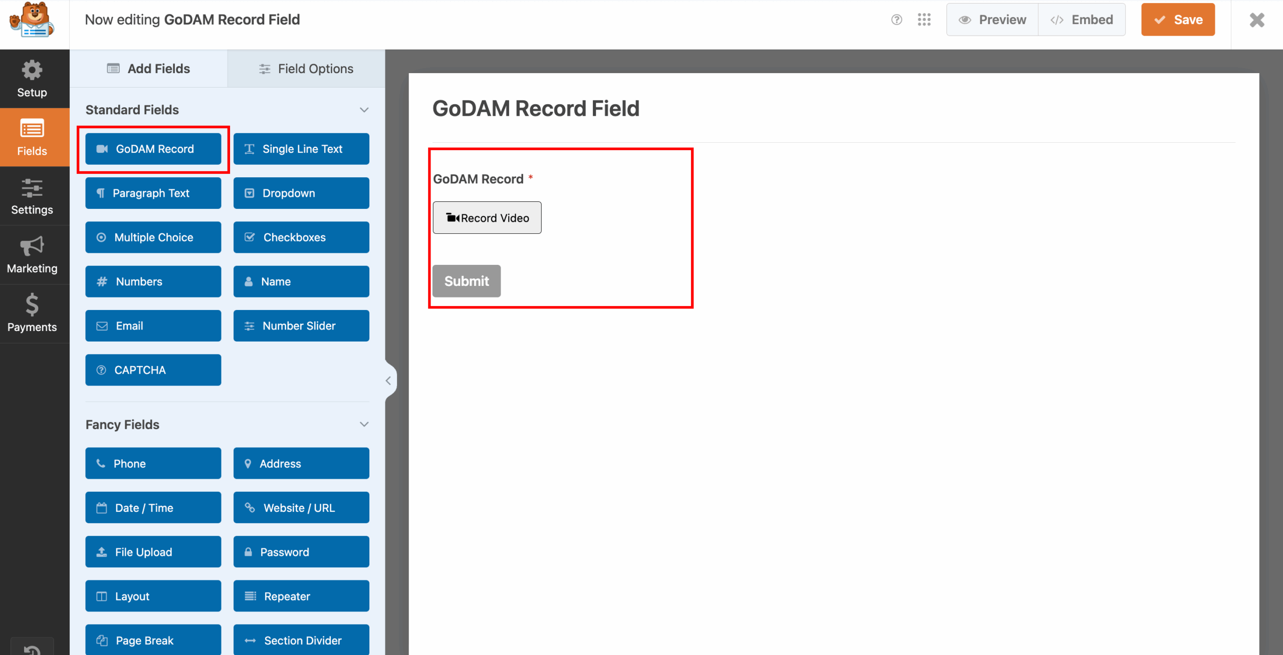 From the available form fields, locate the GoDAM Recorder field and add it to your form. This custom field enables users to record webcam videos, capture screen recordings, or upload video files directly through the form interface. Configure any specific settings for the recorder if needed, then save your form.