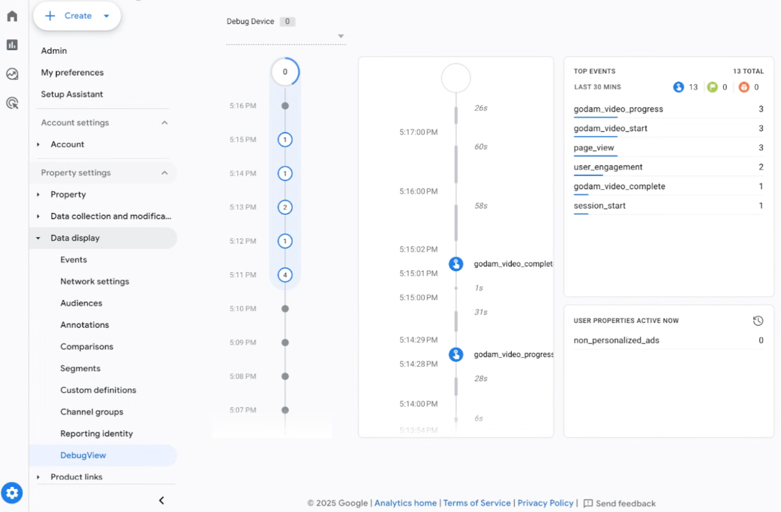 3. Play the video and watch for events in GTM preview