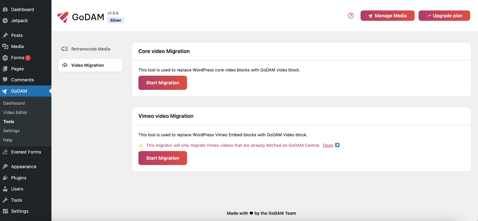 Step 4: Once videos are successfully imported to GoDAM, we can start migration on the WordPress website. Open your WordPress site, go to GoDAM → Tools, c on the Start Migration button on the Vimeo video migration section.