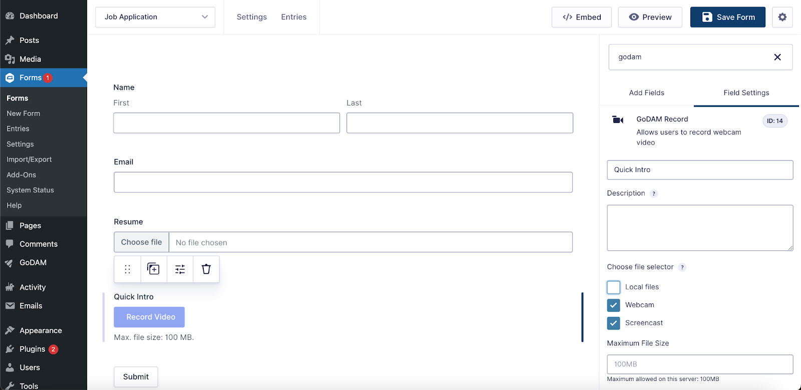 Seamlessly capture webcam, screen recordings, or enable video uploads inside your WordPress forms with GoDAM Recorder, perfect for job applications, identity verification, support tickets and more. Enable richer form submissions in just a few click.