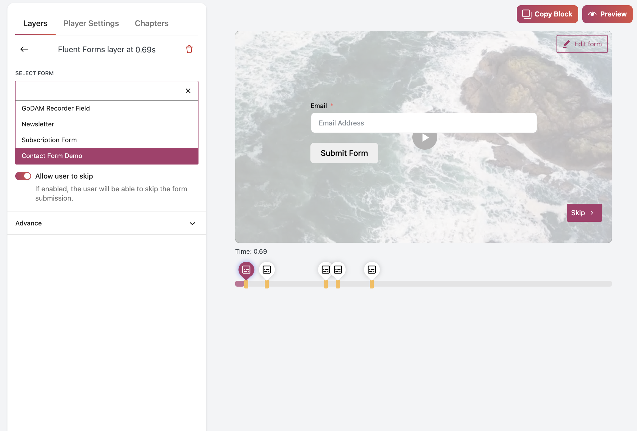 Easily add a Fluent Form as a video layer. Choose exactly when it appears, how it behaves and how it looks. Enable or disable skip, or change background colour.
