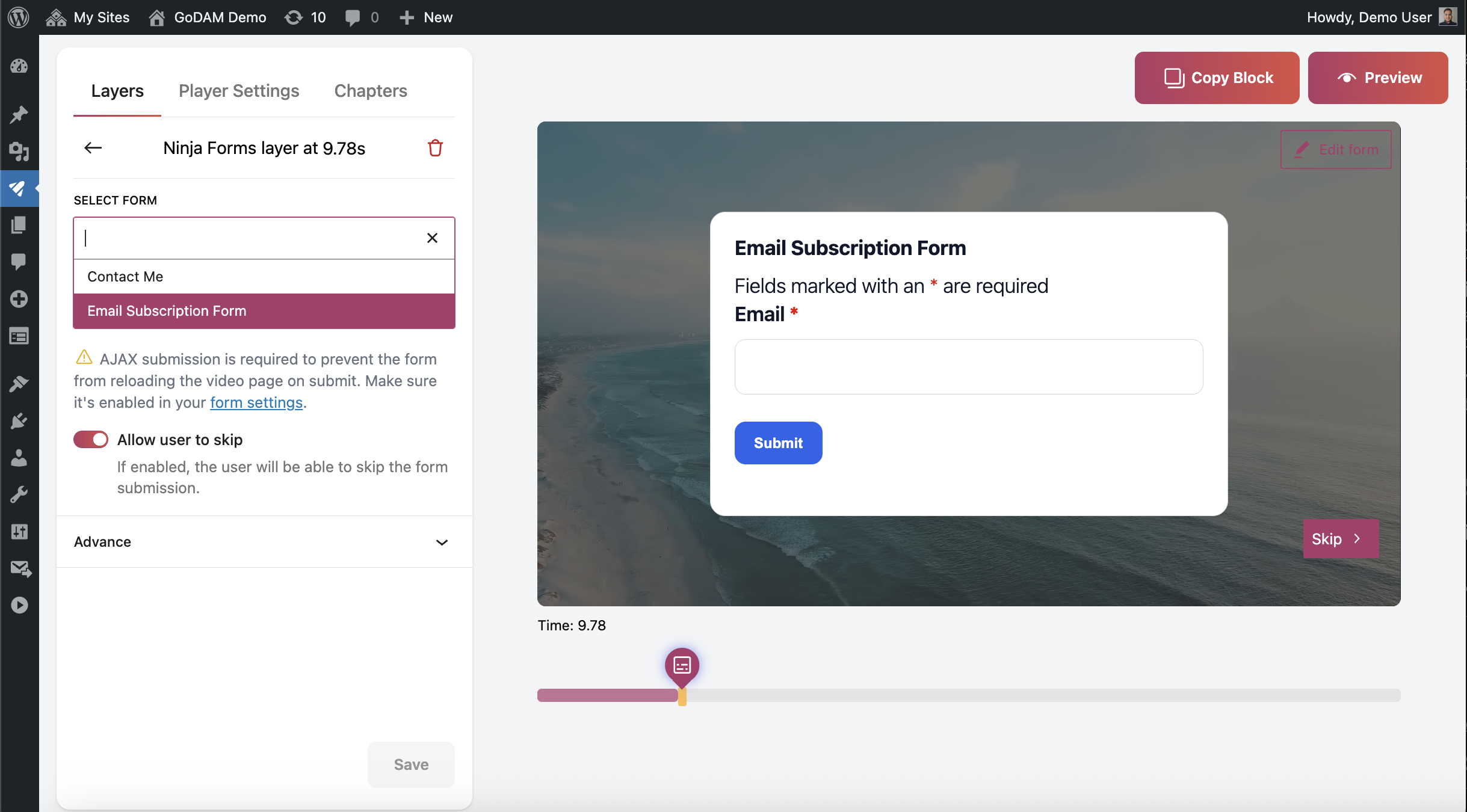 GoDAM automatically scans all your published Ninja forms. All detected forms are instantly available in the video editor, ready to embed at any timestamp.